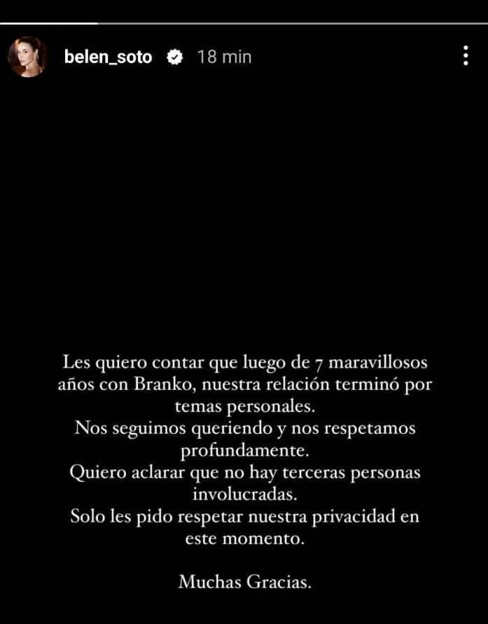 A través de su cuenta de Instagram la actriz se refirió a la situación señalando que “Les quiero contar que luego de 7 maravillosos años con Branko, nuestra relación terminó por temas personales. Nos seguimos queriendo y nos respetamos profundamente”, comenzó señalando en una de sus historias de Instagram.