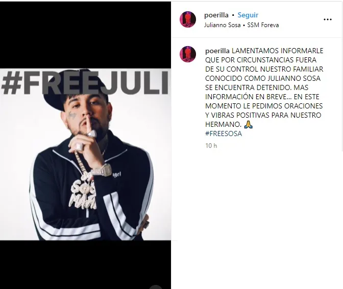 “Lamentamos informarle que por circunstancias fuera de su control, nuestro familiar conocido como Julianno Sosa se encuentra detenido. Más información en breve, en este momento les pedimos oraciones y vibras positivas para nuestro hermano”, escribió.