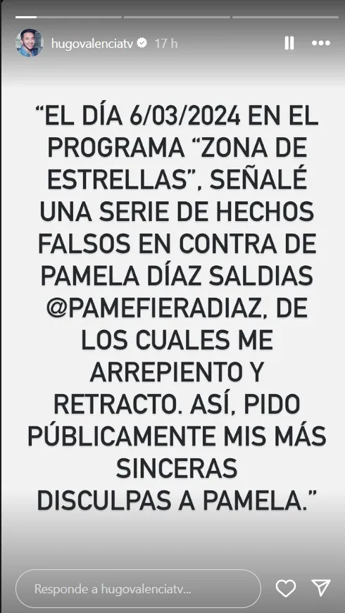 “El día 6/03/2024 en el programa “Zona de Estrellas” señalé una serie de hechos falsos en contra de Pamela Díaz Saldías, de los cuales me arrepiento y retracto. Así, pido públicamente mis más sinceras disculpas a Pamela“, señalan en el comunicado.