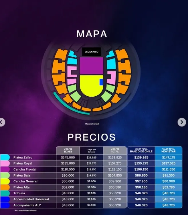 Mientras que entre las ubicaciones más caras se encuentran Cancha Frontal a $111.650 y Platea Royal a $137.025. La ubicación más costosa es Platea Zafiro, que queda en un valor de $147.175 con descuento.