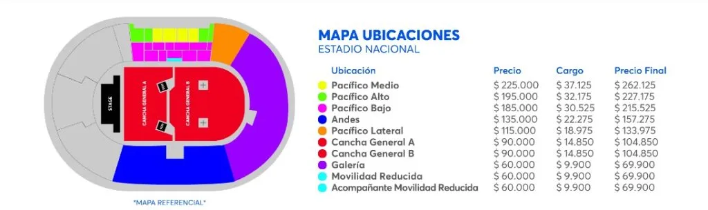 Los precios de las entradas varían según la ubicación en el Estadio Nacional. La opción más económica es Galería, con un valor de $69.900, seguida de Cancha General B y Cancha General a $104.850. La entrada para Pacífico Lateral tiene un precio de $133.975, mientras que Andes cuesta $157.275.