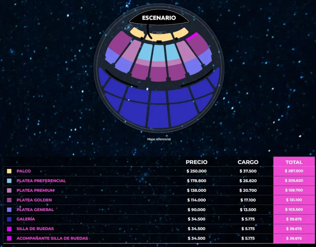 Las entradas se encuentran disponible a través de Sistema Puntoticket. Los costos de las entradas varían según la ubicación. La entrada para la galería tiene un precio de $39,675, seguida de la Platea General con un valor de $103,500. Por su parte, las entradas para Platea Golden y Platea Premium tienen costos de $131,100 y $158,700 respectivamente. La entrada más cara, que incluye un cargo adicional, es la de Palco, con un costo total de $287,500.