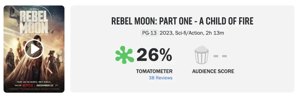 “Rebel Moon es la primera película que que me hace abandonar la sala en mucho, mucho tiempo. Una sorprendente falta de drama, dirección excesiva agresiva y mala actuación en todo momento. Un buffet absoluto para los que odian a Zack Snyder”.
