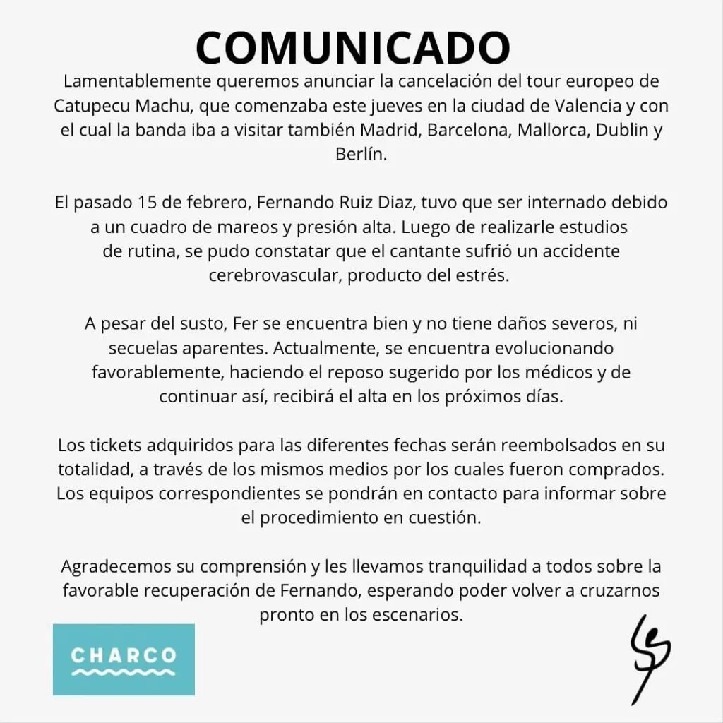 Mediante un comunicado en redes sociales, Catupecu Machu reveló que su gira se posponen hasta nuevo aviso debido a que su vocalista Fernando Ruíz Díaz tuvo que ser internado debido a un cuadro de mareos y presión alta que finalmente reveló que sufrió de un accidente cerebrovascular.