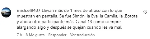 Lo cierto es que Canal 13 no ha dado explicaciones al respecto y los televidentes ya llenan de mensajes sus publicaciones con mensajes preguntando por la eliminación y que ya se sabe quién es el nuevo eliminado.