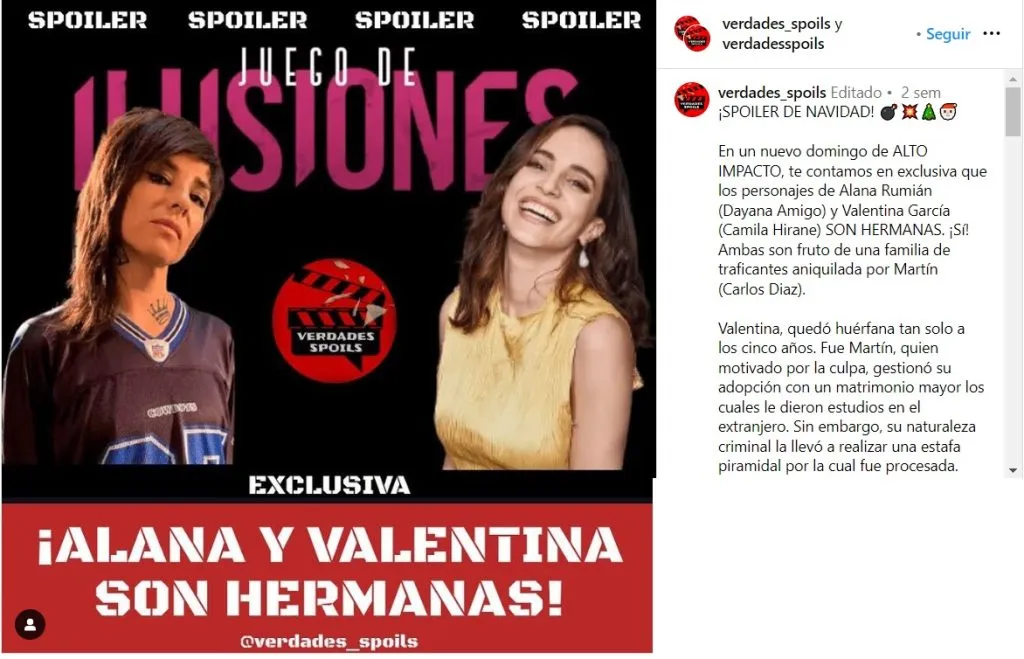 Según la cuenta Verdades_Spoils, dedicada a revelar spoilers de las producciones nacionales, Valentina (Camila Hirane) y Alana (Dayana Amigo) son hermanas, pero ellas no lo saben… aún.