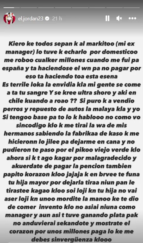 A través de sus historias de Instagram, el artista reveló los motivos del despido. “quiero que todos sepan que al Markito (mi ex manager), tuve que echarlo por doméstico. Me robó cualquier millones cuando me fui para España y está haciéndose el wn para no pagar, por eso me está haciendo toda esta escena”.