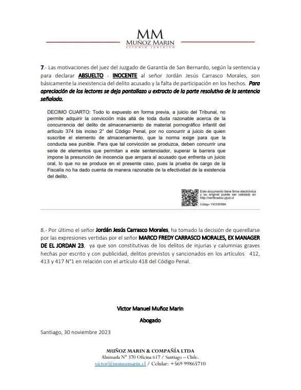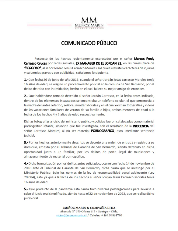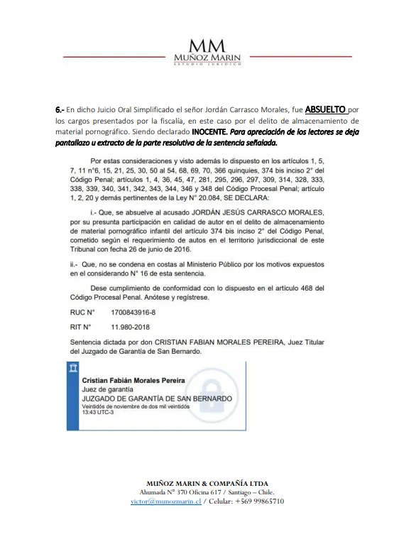“Dichas fotografías a juicio del ministerio público y policías fueron catalogadas como material pornográfico infantil, situación que fue investigada, con el resultado de la INOCENCIA del señor Carrasco Morales, al no ser material PORNOGRÁFICO, esto, mediante sentencia judicial”, señala el documento.