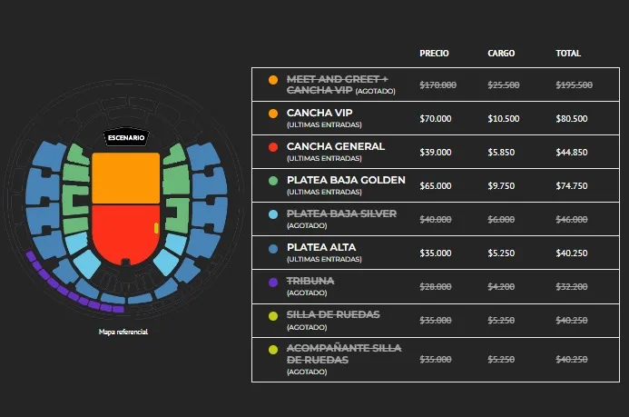 Las entradas se encuentran disponibles a través de sistemas Puntoticket y quedan disponibles las ubicaciones Cancha Vip a un valor de $80.500, seguido de Cancha General a $44.850, Platea Baja Golden a $74.750 y Platea Alta a $40.250.