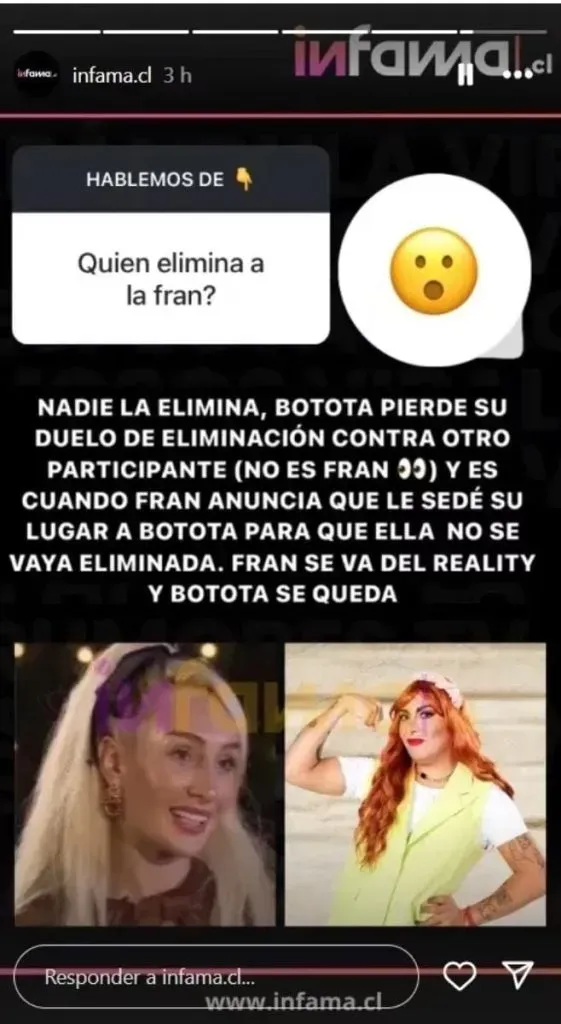 “Botota pierde su duelo de eliminación contra otro participante (no es Fran)”, agregando que en ese momento “Fran le cede su lugar para que ella no se vaya eliminada. Fran se va del reality y Botota se queda”, expresó el medio a través de su cuenta de Instagram.
