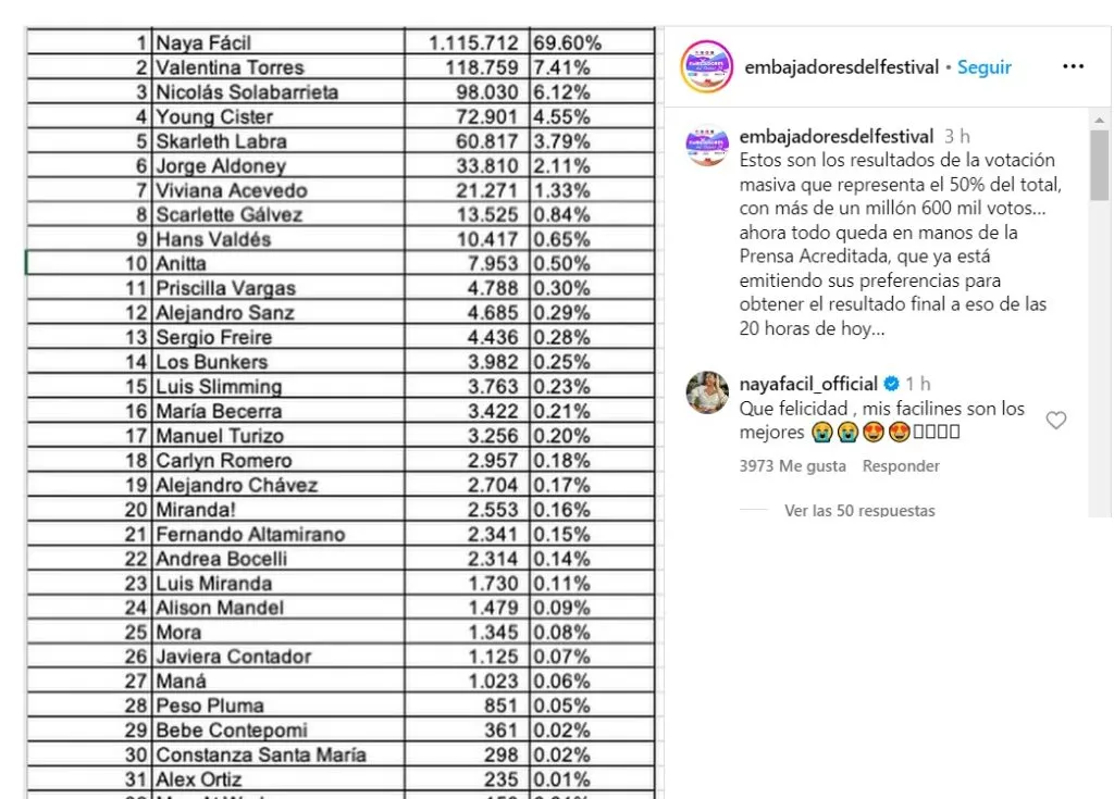 Con el 69% de los votos populares, Naya Fácil ha logrado conquistar el afecto del público, junto al ex participante de Tierra Brava, Nicolás Solabarrieta, que se llevó el 6,12% de los votos.