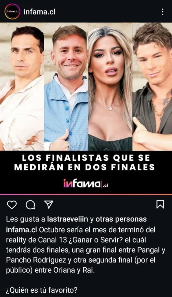 Según Infama, quienes llegan a la gran final son Oriana Marzoli, Raimundo Cerda, Pangal Andrade y Francisco Rodríguez, cuyo ingreso al programa todavía no se ve en pantalla. En donde revelaron que se realizarían dos competencias distintas, una por voto del público, en donde Rai y Oriana se enfrentarán.