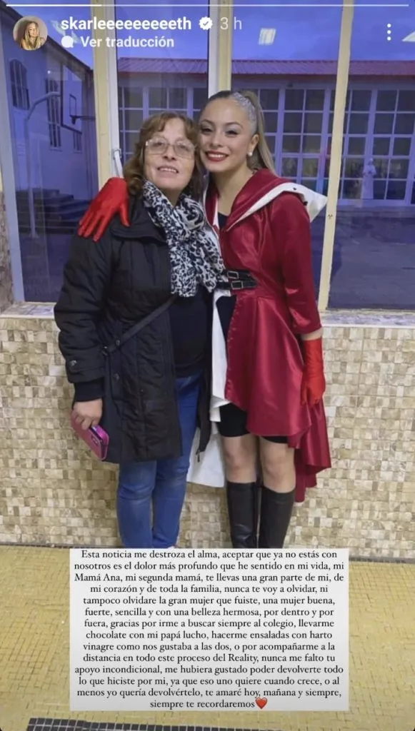 “Esta noticia me destroza el alma, aceptar que ya no estás con nosotros es el dolor más profundo que he sentido en mi vida, mi Mamá Ana, mi segunda mamá, te llevar una gran parte de mi, de mi corazón y de toda la familia“, comenzó en la historia Skarleth.