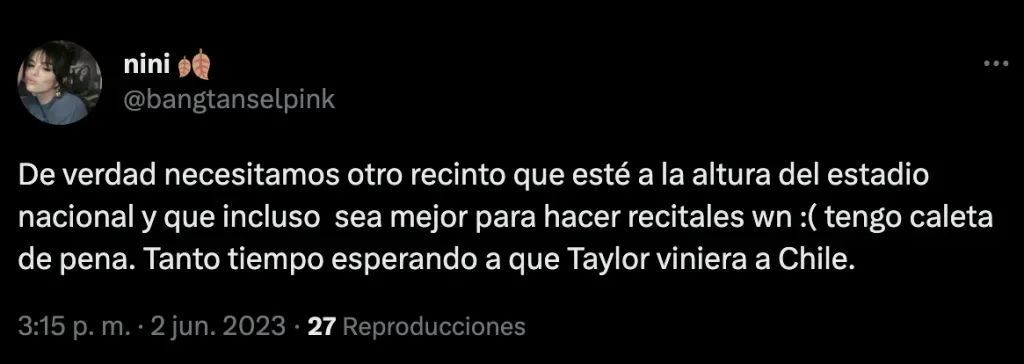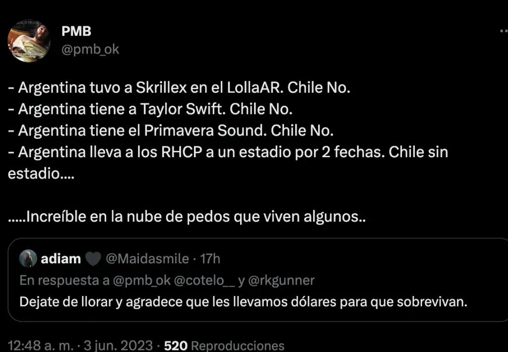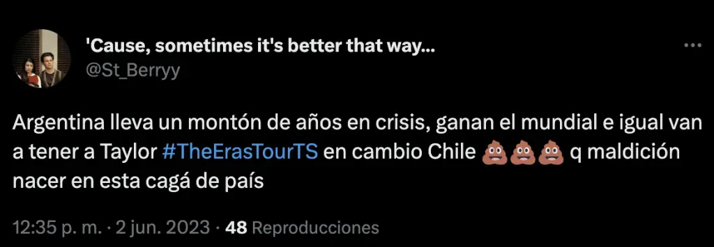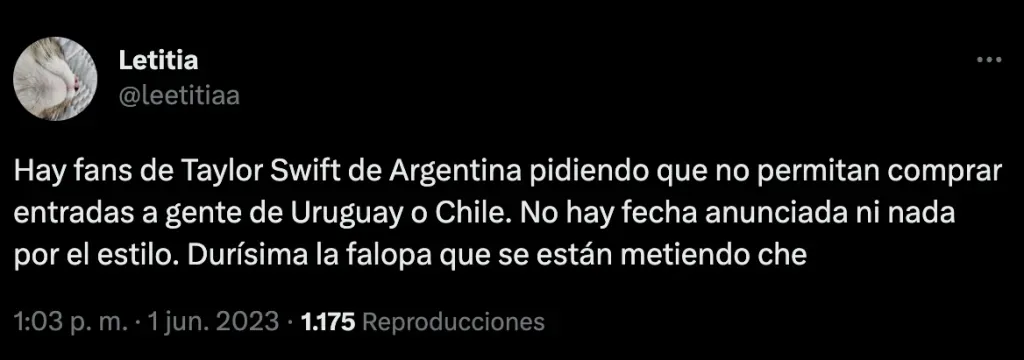 De hecho en varios post o comentarios cruzados desde Argentina decían que las chilenas no podrían comprar tickets; o mostrando su malestar de que vayan. Esto dejando a las fans de Chile complicadas por no poder ir a ver a Taylor en vivo o avisando que igual irían sin importar qué piensen al otro lado de la cordillera.