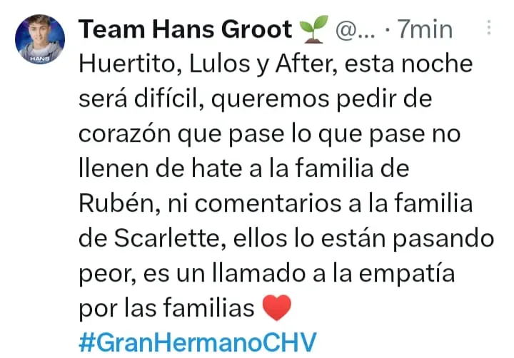 Agregando que ambos están con contención sicológica “que permita velar por su salud y bienestar. Este apoyo es extensivo también para el resto de los jugadores de Gran Hermano Chile que así lo requieran”, concluye la misiva.