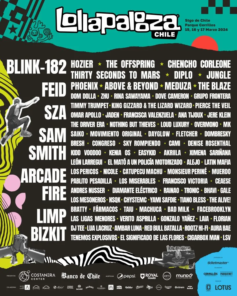 Lollapalooza tendrá su edición 2024 el 15, 16 y 17 de marzo en el Parque Cerrillos tal como en 2023. Y el line up tiene entre los destacados a Sam Smith, Blink-182, SZA, Feid, Thirty Seconds to Mars y muchos más. Revisa a continuación el line up completo: