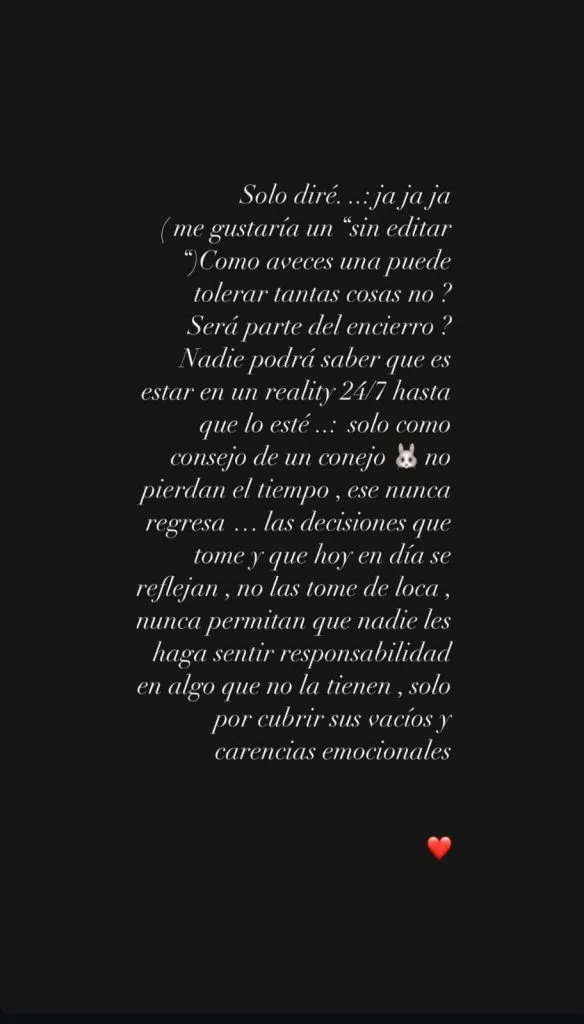 “Solo diré: ‘Ja ja ja’. Me gustaría un ‘sin editar’”, aseguró de entrada. “¿Cómo a veces una puede tolerar tantas cosas? ¿Será parte del encierro? Nadie podrá saber que es estar en un reality 24/7 hasta que lo esté”, agregó Shirley.