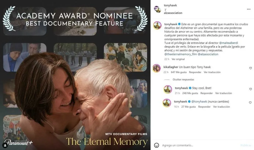 El skater profesional hizo una publicación en Instagram donde califica a la película como una “poderosa historia de amor en su centro” y que es “Altamente recomendado a cualquier persona que haya sido afectada por esta incesante y omnipresente enfermedad”, para finalmente indicar que tuvo el privilegio de entrevistar a la chilena, Maite Alberdi, directora de la película nacional.