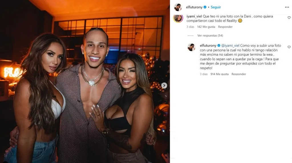 Una seguidora le comento “qué feo. Ninguna foto con Dani. Como quieran, compartieron juntos casi todo el reality”, a lo que Futuro respondió: “Cómo voy a subir una foto con una persona la cual no hablo ni tengo relación”.