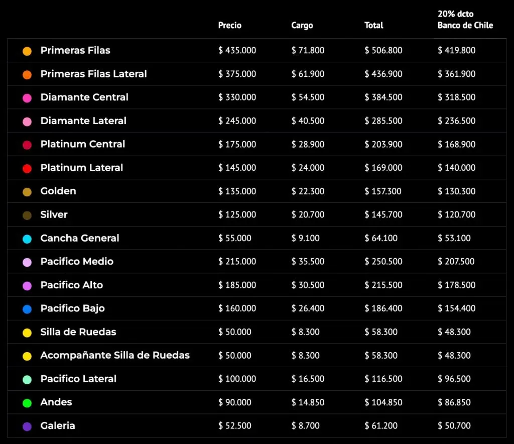 Revisa a continuación los precios de las entradas para ver al Sol de México el próximo año en el Estadio Nacional, recuerda que pagando con tarjetas Banco de Chile tienes un 20%: