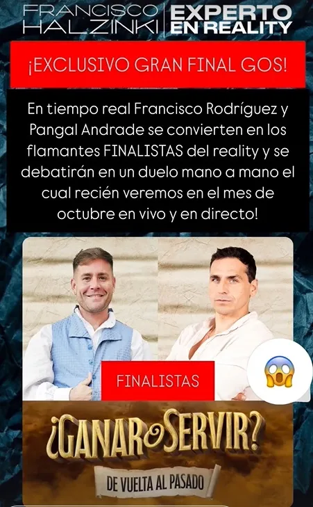 Según lo publicado por Francisco Halzinki en su cuenta experto en reality, quienes se enfrentarían en la Gran Final el espacio son Francisco Rodríguez y Pangal Andrade.