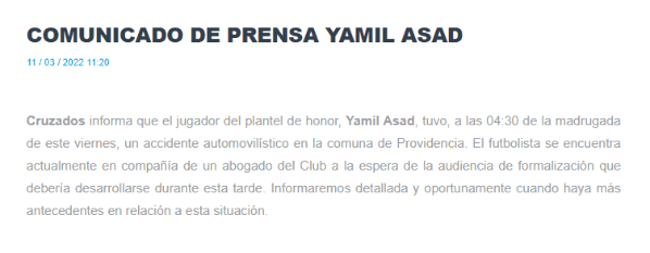 Desde Cruzados dieron a conocer su postura oficial, dando respaldo al mediocampista que fue uno de sus refuerzos para este Campeonato Nacional.”El jugador del plantel de honor,Yamil Asad, tuvo, a las 04:30 de la madrugada de este viernes, un accidente automovilístico en la comuna de Providencia”, comienza el texto difundido.