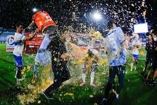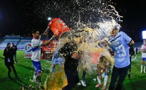 Fernando Zampedri y Matías Dituro aparecieron por detrás del entrenador con un balde de una conocida bebida isotónica para dejar caer todo el contenido sobre el entrenador de la Católica.