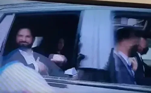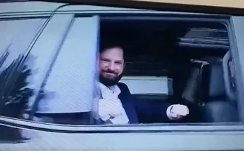 Como es habitual Boric no escondió su amor por los colores y respondió haciendo el icónico gesto de la franja cruzando el pecho.