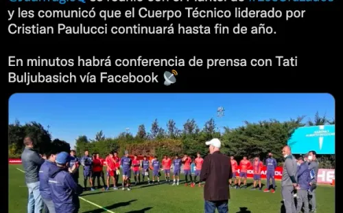 A través de sus redes sociales, el club señaló que fue el propio mandamás del elenco de la franja quien le informó la medida al equipo. “Antes del inicio del entrenamiento, el Presidente Juan Tagle se reunió con el Plantel de los cruzados y les comunicó que el Cuerpo Técnico liderado por Cristian Paulucci continuará hasta fin de año“, señalaron.