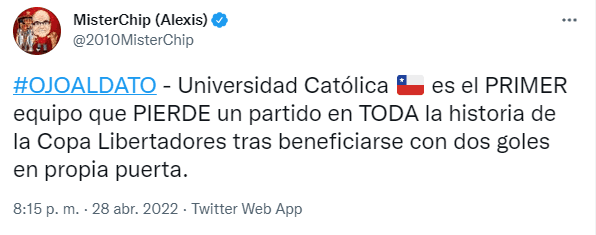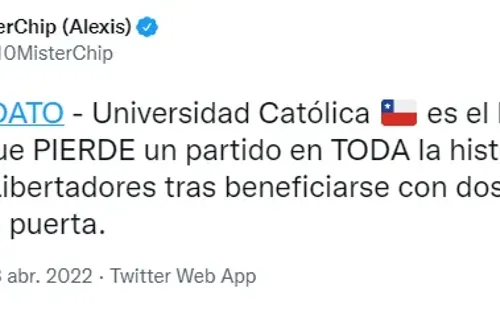 “Universidad Católica es el primer equipo que pierde un partido en toda la historia de la Copa Libertadores tras beneficiarse con dos goles en propia puerta”, escribió la reconocida figura de las redes sociales. Sin duda un trago amargo del que deben pasar página lo más pronto posible.