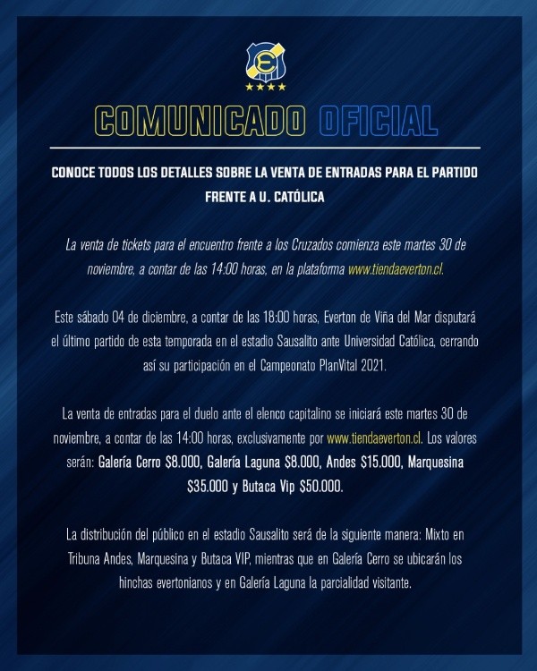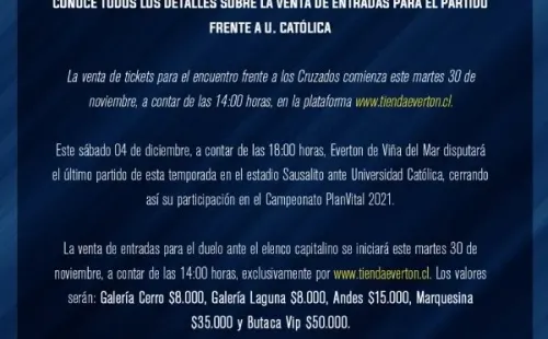 De cara a este vital compromiso, la venta de entradas comenzará este martes por parte del cuadro ruletero, a través de su plataforma tiendaeverton.cl, en la que estarán a disposición los ocho mil boletos que podrán comprar los fanáticos de los Cruzados para el compromiso en el estadio Sausalito.