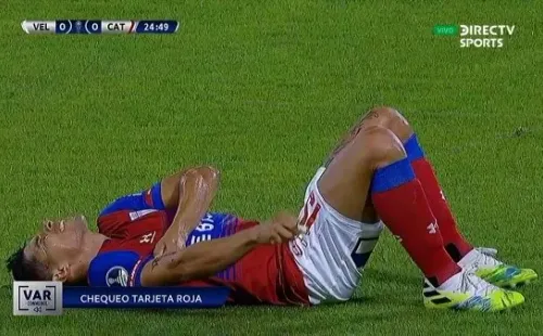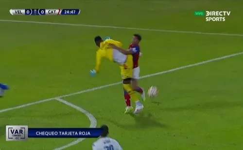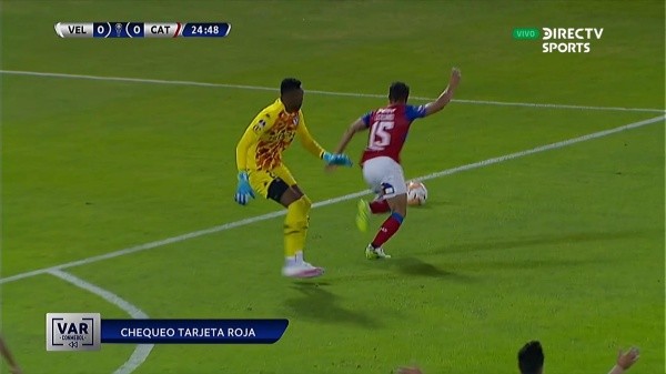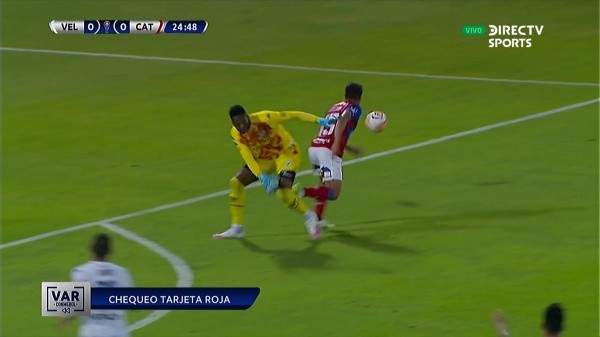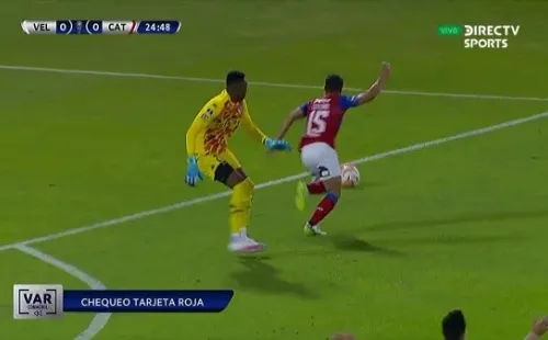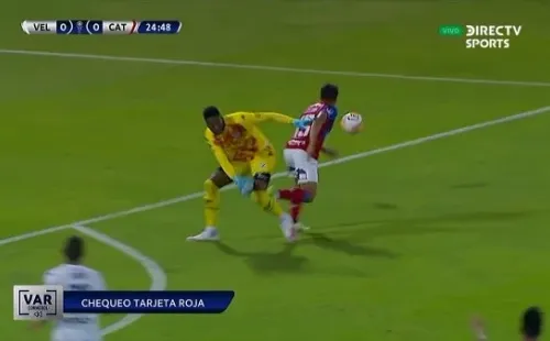 El portero ecuatoriano salió con el pie en alto golpeando de lleno al delantero de los Cruzados, provocándole incluso un corte en el brazo y decretando chequeo VAR para determinar si merecía o no tarjeta.