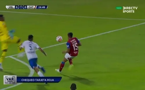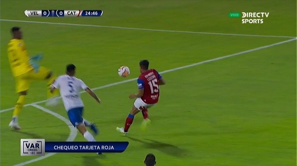 Corrían 24 minutos de juego cuando Gastón Lezcanorematócon la derecha desde fuera del área, en un tiro que se fue alto y que el arquero de Vélez, Alexander Domínguez, salió a cortar de manera temeraria.