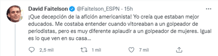 El popular David Faitelson fue más allá: “Cómo puede el América atreverse a contar en sus filas con un golpeador de mujeres en un país como el nuestro, con uno de los índices de feminicidios más altos del mundo”.
