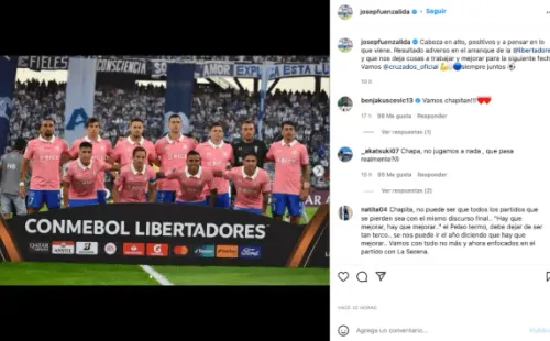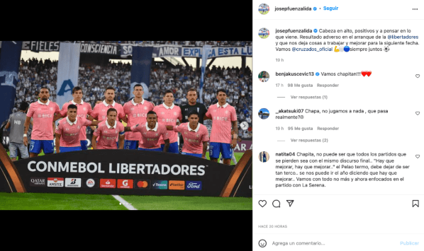 “Resultado adverso en el arranque de la Libertadoresy que nos deja cosas a trabajar y mejorar para la siguiente fecha. ¡Vamos Cruzados! Siempre juntos”, agregó el capitán de la franja.