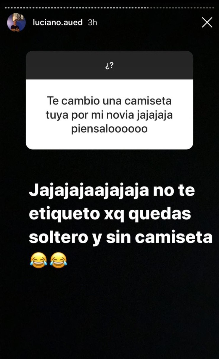 Una de ellas fue la de un seguidor de Aued, quien le escribió “te cambio una camiseta por mi novia jajajaja piénsalo”. El jugador no dudo en responder y salió jugando: “jajajajaja no te etiqueto porque quedas soltero y sin camiseta”.