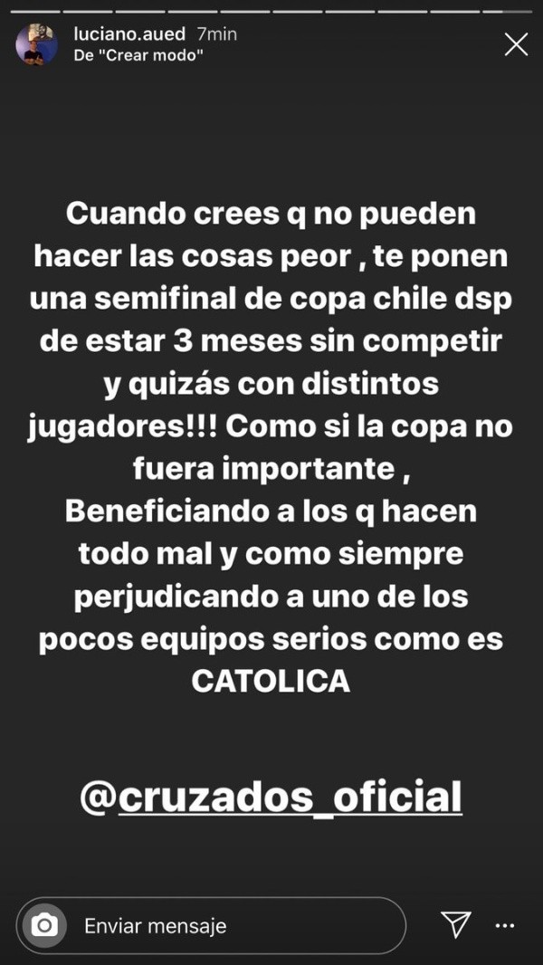 La UC deberá enfrentar a Colo Colo y Universidad de Chile hará lo propio con Unión Española. Esta programación hizo enojar al volante Luciano Aued, que en su cuenta de Instagram escribió: “Cuando crees que no pueden hacer las cosas peor, te ponen una semifinal de Copa Chile después de estar tres meses sin competir y quizás con distintos jugadores!!!”
