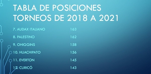 “Colo Colo es tercero con 184, es decir a 63 unidades de diferencia en los últimos cuatro años. Colo Colo no jugó un torneo, se borró de uno… bueno, el torneo pasado, está claro. La U recién aparece sexta con 172 positivos, a 75 de la Católica”, explica el rostro de la casa.
