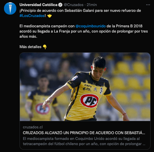 Los Cruzados confirmaron que Sebastián Galani está a solo detalles de ser nuevo refuerzo del club para la temporada 2022. El volante, que hasta hace algunos días estuviera en las filas de los Azules, cambiará de colores para ir por el desafío en la Copa Libertadores.