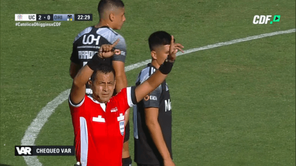 Puch festejaba su gol maradoniano, pero el árbitro Julio Bascuñán recibió la alerta del VAR. ¿Desenlace? Gol anulado por fuera de juego del atacante de la UC al recibir la pelota en mediocampo.