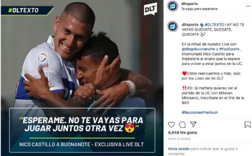 En ese contexto, en pleno Instagram Live de Buonanotte con el portal DLT Sports, el ex delantero de la UC le mandó un particular mensaje que ilusiona a los hinchas Cruzados: “Espérame. No te vayas para jugar juntos otra vez”.