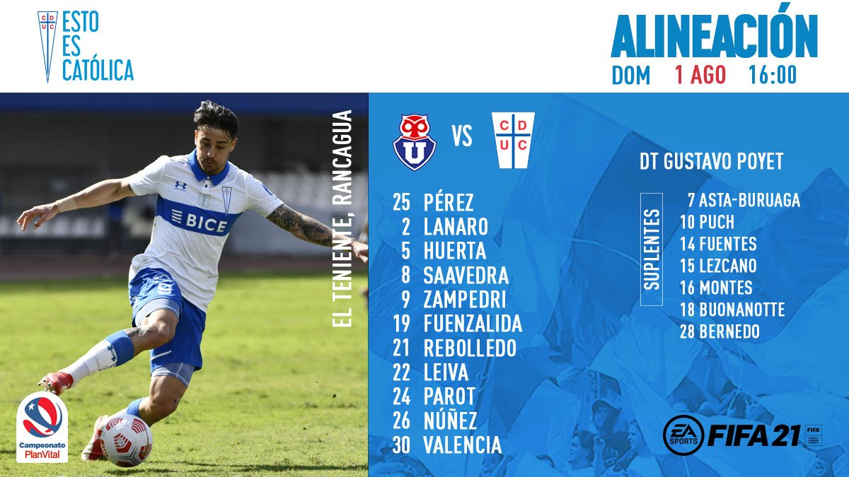 El estratega confirmó la formación y la UC formará con: Sebastián Pérez; Raimundo Rebolledo, Germán Lanaro, Valber Huerta, Alfonso Parot; Marcelino Núñez, Ignacio Saavedra, Juan Leiva, José Pedro Fuenzalida, Diego Valencia y Fernando Zampedri.