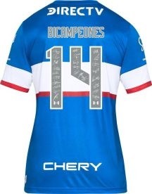 Tras conseguir la corona, los jugadores de La Franja se vieron con una camiseta que lleva el 14 estampado entre el escudo conmemorativo y el logo de Under Armour. En la espalda un vistoso “bicampeones” y el mismo número del pecho.