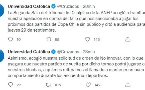 “La Segunda Sala del Tribunal de Disciplina de la ANFP acogió a tramitación nuestra apelación en contra del fallo que nos sancionaba a jugar los próximos dos partidos de Copa Chile sin público y citó a audiencia para el jueves 29 de septiembre”, escribieron a través de sus canales oficiales.
