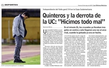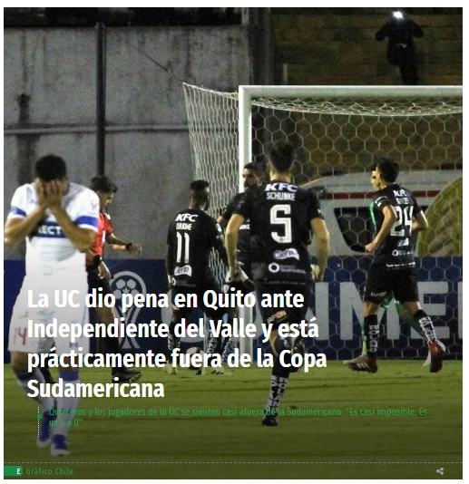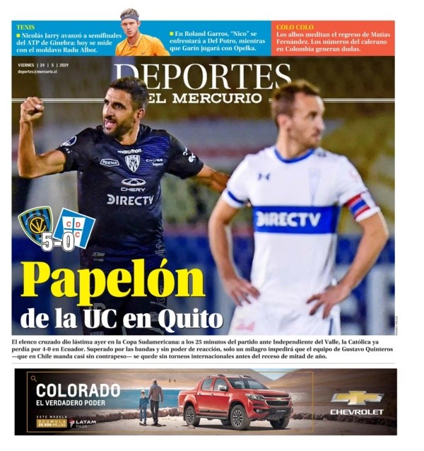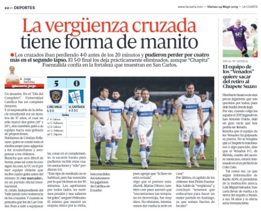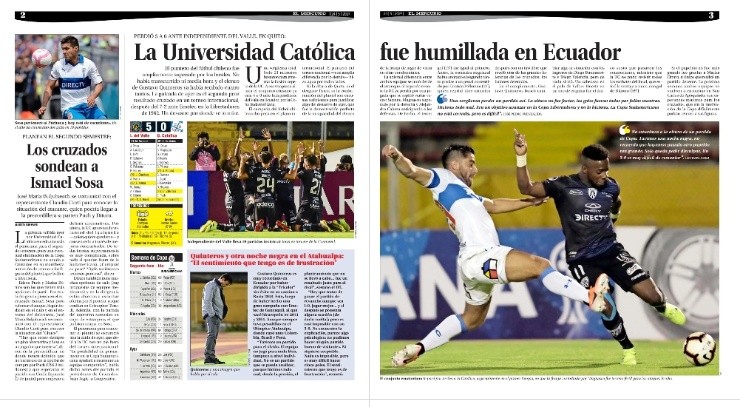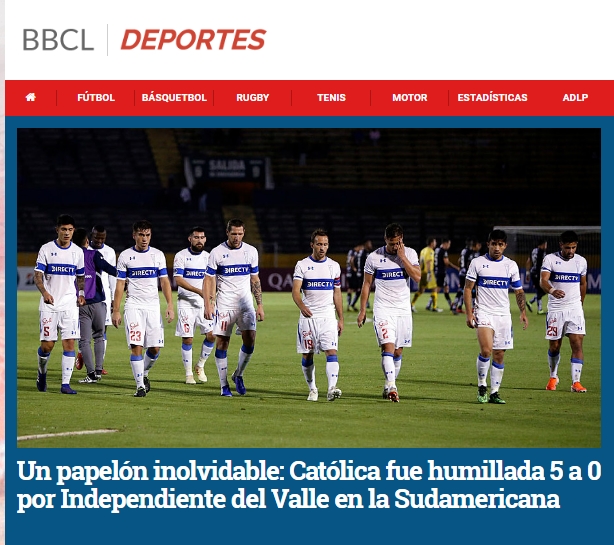 “Verguenza histórica”, “con forma de manito” y “la UC fue humillada en Ecuador”, fueron algunos de los títulos que dejó la prensa chilena después de la derrota por 5-0 de Universidad Católica ante Independiente del Valle, en el partido de ida de la segunda fase de la Copa Sudamericana.
