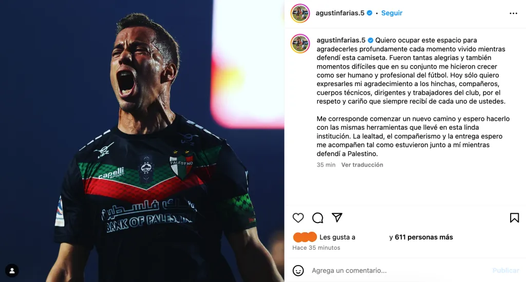 El futbolista también le dijo adiós a Palestino. “Quiero ocupar este espacio para agradecerles profundamente cada momento vivido mientras defendí esta camiseta. Fueron tantas alegrías y también momentos difíciles que en su conjunto me hicieron crecer como ser humano y profesional del fútbol”, señaló Farías.