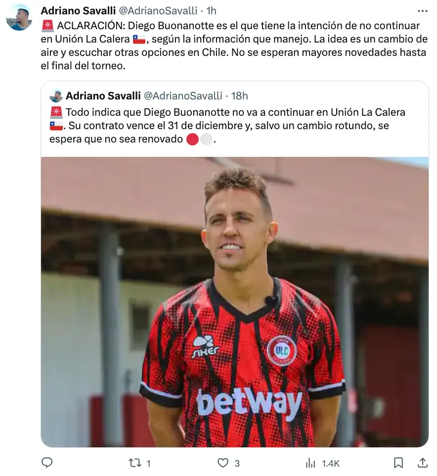 “ACLARACIÓN: Diego Buonanotte es el que tiene la intención de no continuar en Unión La Calera, según la información que manejo. La idea es un cambio de aire y escuchar otras opciones en Chile. No se esperan mayores novedades hasta el final del torneo”, añadió sobre el mediocampista.