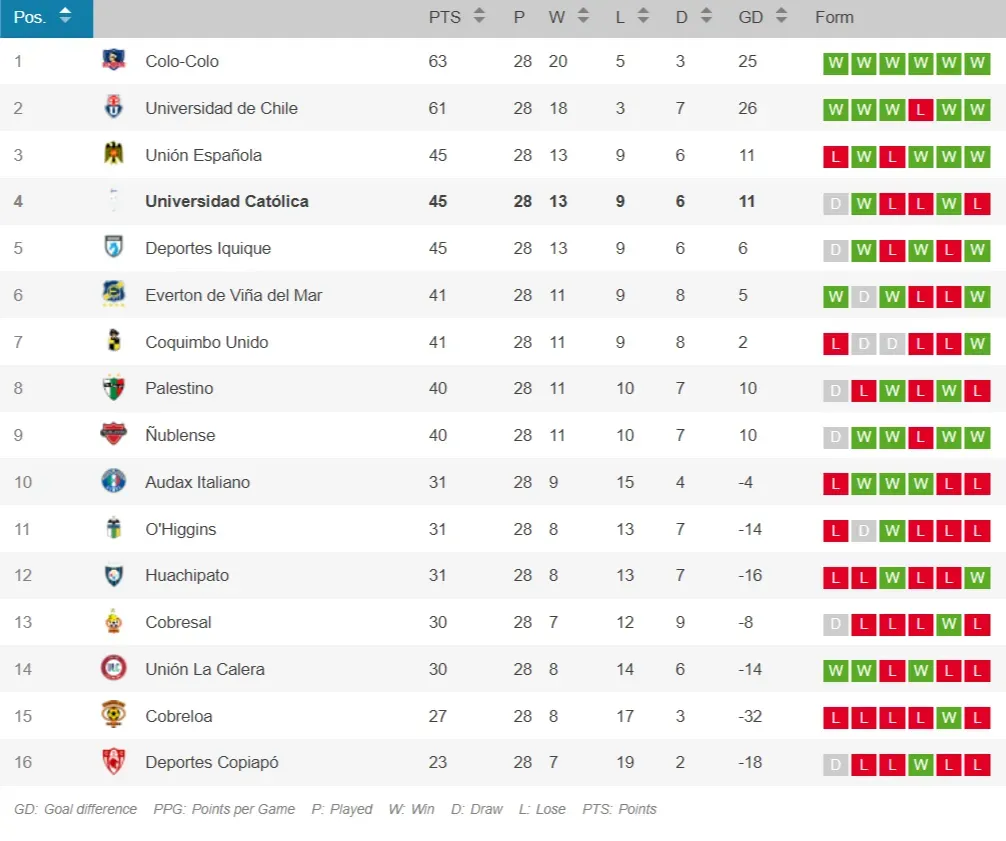Universidad Católica es uno de los tres equipos que suma 45 puntos al cabo de 28 partidos jugados en el Campeonato Nacional 2024.