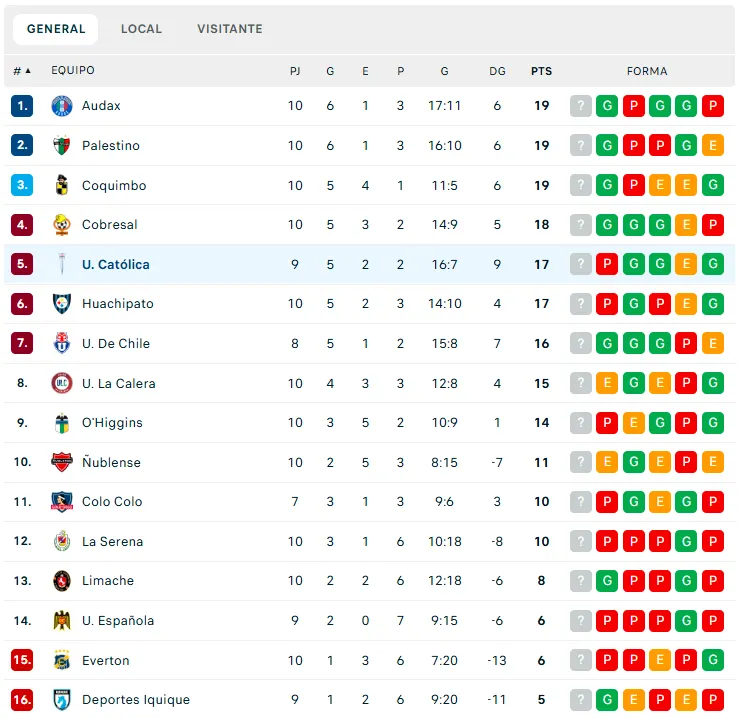 El equipo que dirige Tiago Nunes se ubica en la quinta ubicación de la Tabla de Posiciones en Liga de Primera con 17 puntos, a dos de los tres líderes del fútbol chileno, como Palestino, Audax Italiano y Coquimbo Unido.