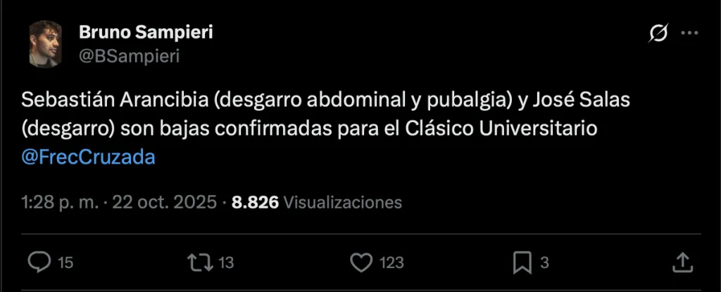 A las bajas de Clemente Montes por acumulación de tarjetas amarillas, y el argentino Fernando Zuqui recuperándose de su grave lesión de rodilla, el periodista Bruno Sampieri dio a conocer que Católica suma dos nuevas bajas, ambas por problemas musculares.